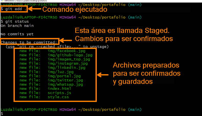 Changes to be committed (cambios preparados para confirmación).