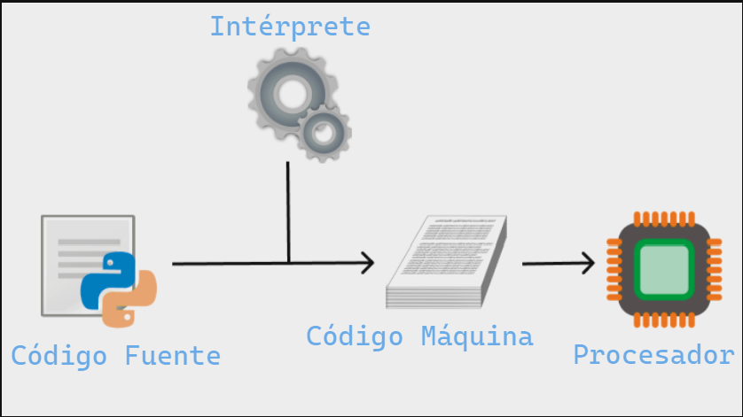 Esto quiere decir que la implementación del lenguaje Python en cada computadora se realiza mediante un proceso en el que uno de los principales componentes es el intérprete.
